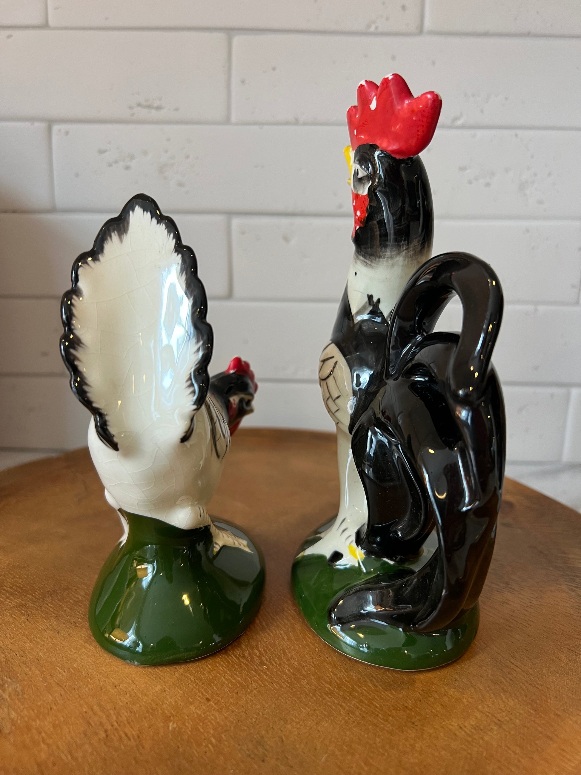 Add a touch of charm and nostalgia to your home with our vintage rooster and hen figurines. These beautifully-crafted pieces evoke a sense of rustic simplicity and will add a unique touch to any decor. Made with intricate detail and lasting quality, these figurines are a must-have for any collector or lover of farmhouse decor. There are no chips but the paint shows a little wear , this does not diminish the beauty of these two pieces , it only adds to the vintage charm . Rooster - 7”x 4.5” , Hen - 6”x 5”